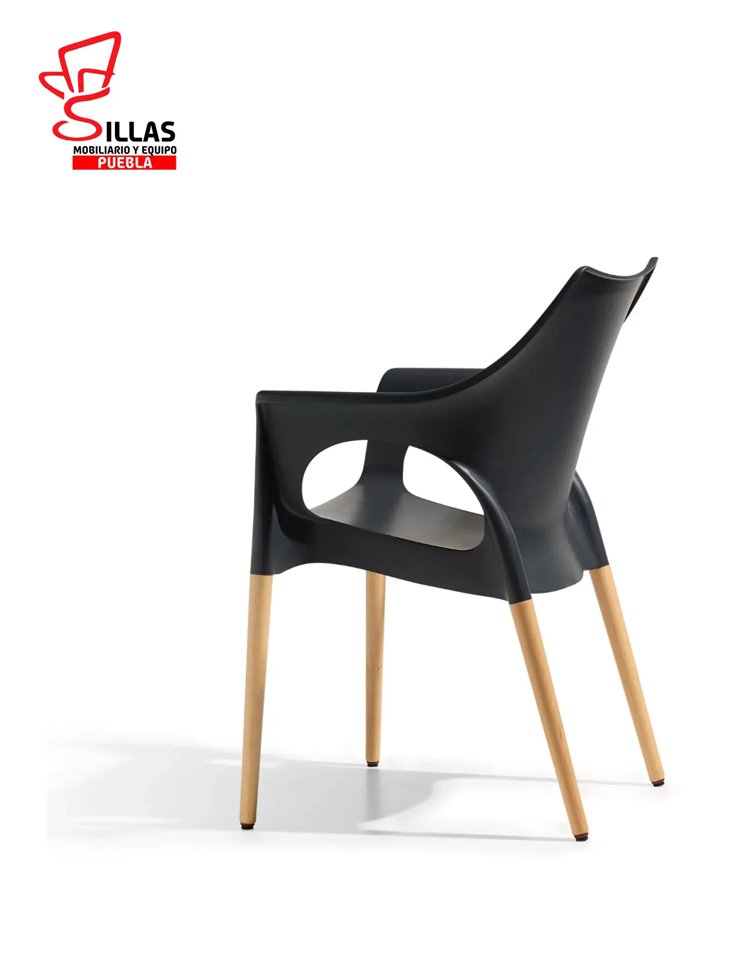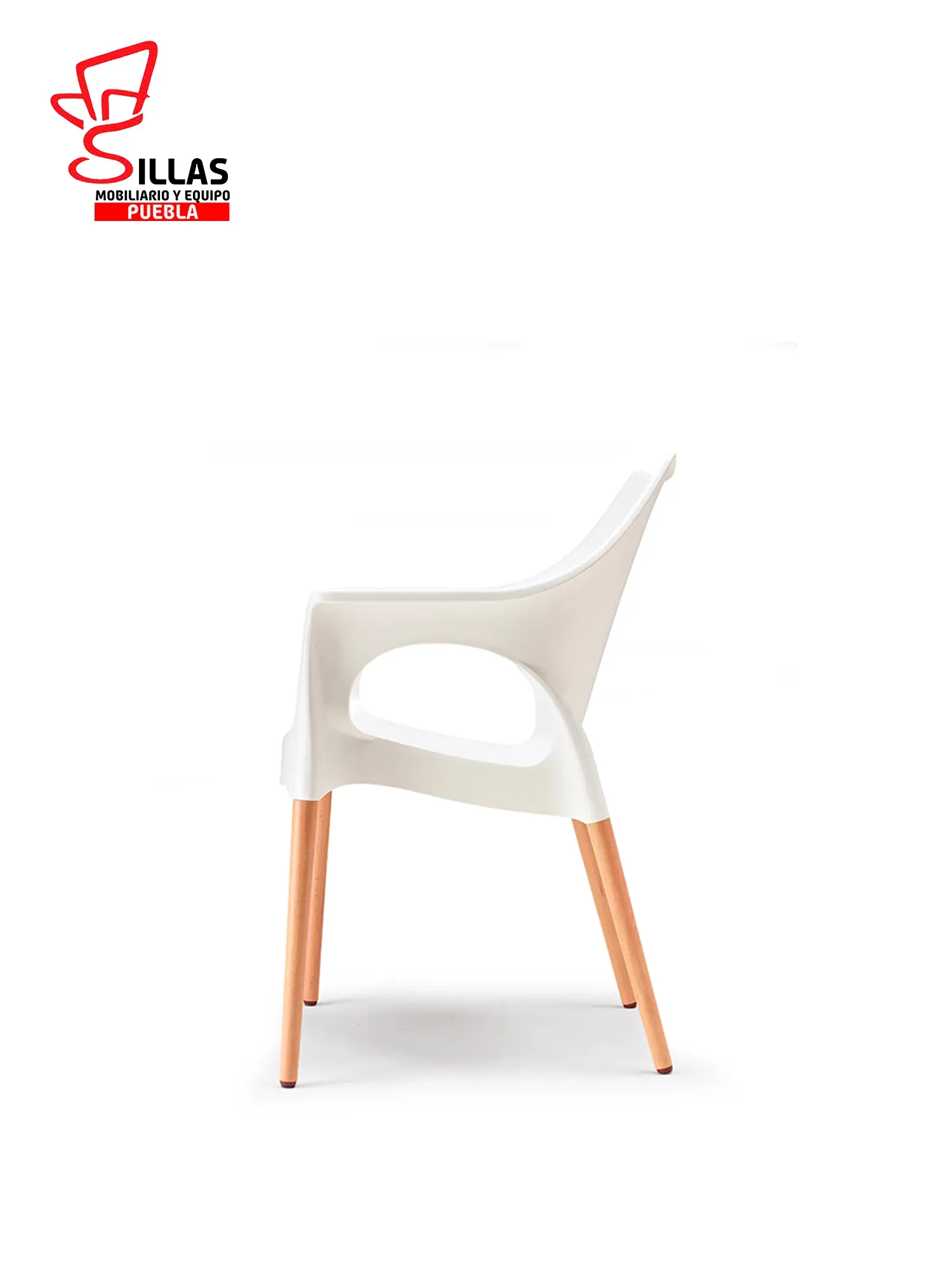 Una silla que da un toque especial a cualquier espacio. Asiento y respaldo de polipropileno. Patas de haya natural. Para uso en interiores. Apilable.
