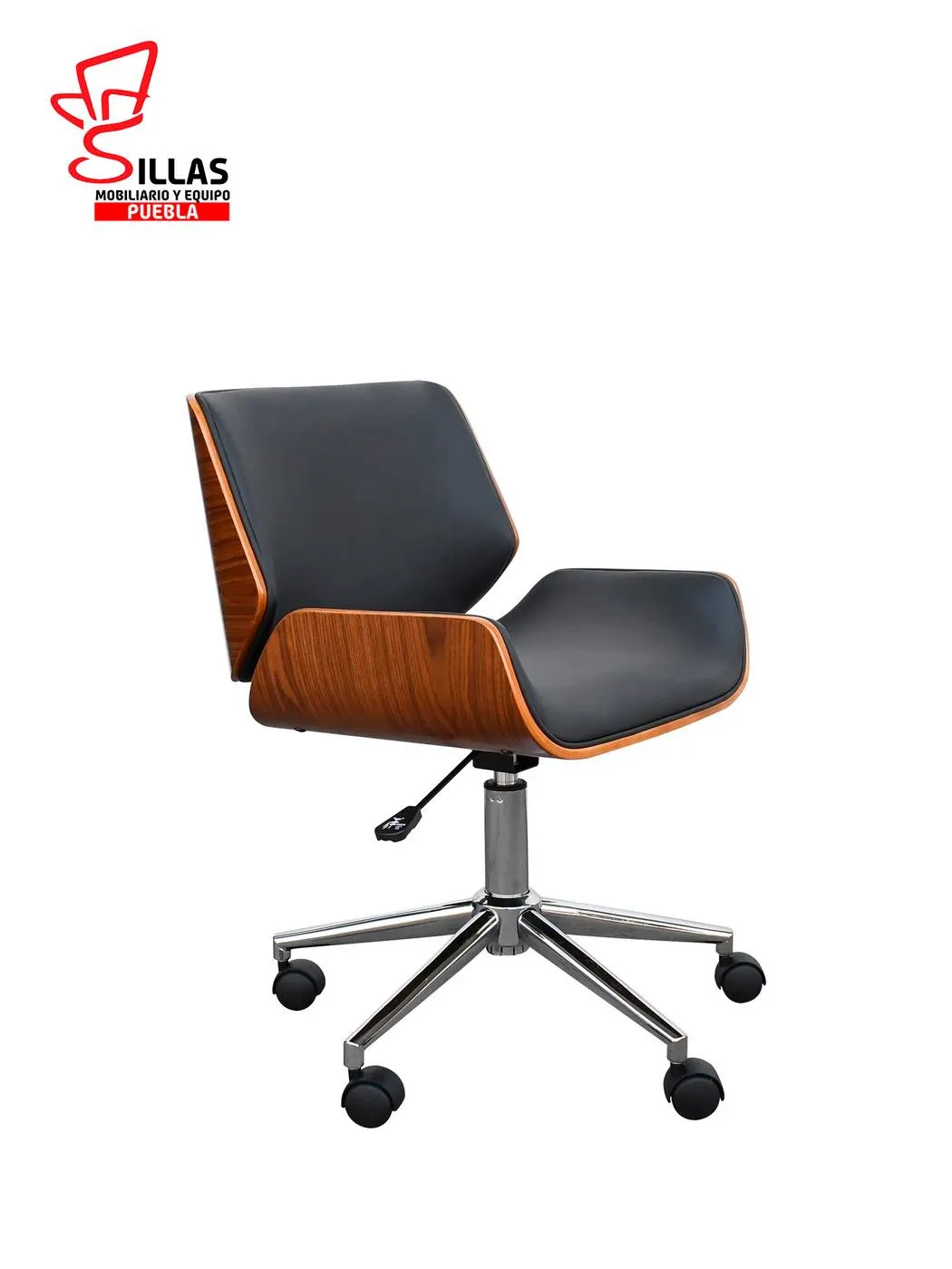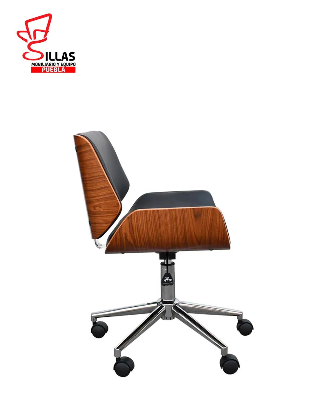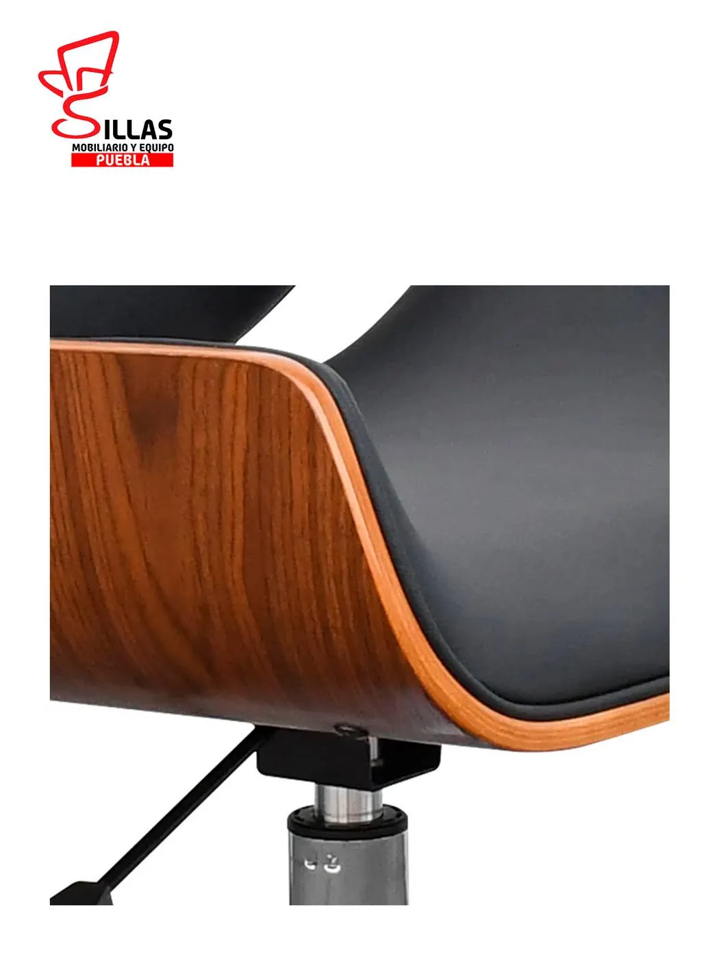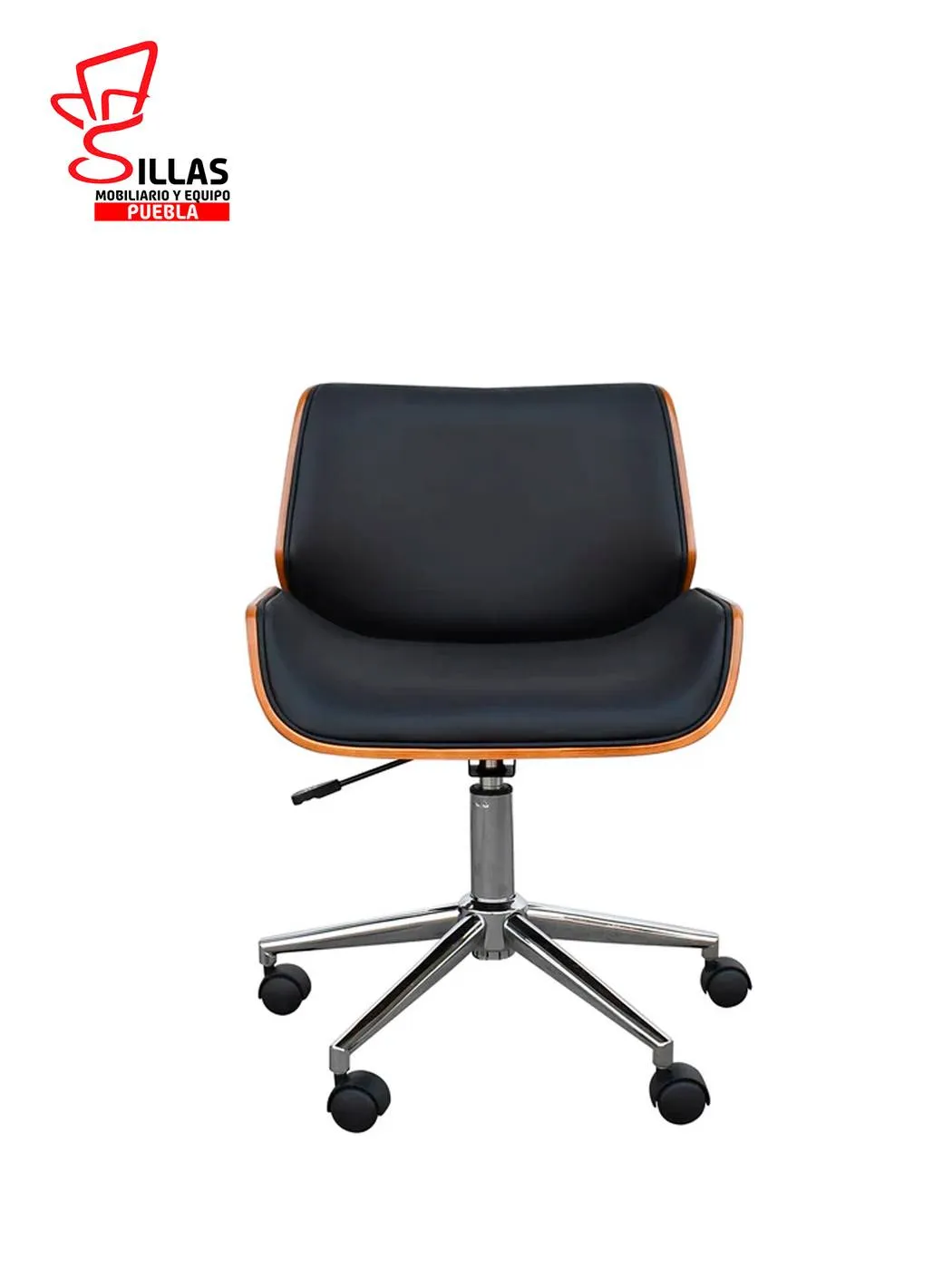 Silla Secretarial Ehud * Fabricada en madera termoformada de nogal , asiento y respaldo tapizado en Tactopiel color negro , dotada de estrella color cromo y ruedas de poluretano * Ancho: 53 Profundidad: 55 Altura: 81 cms