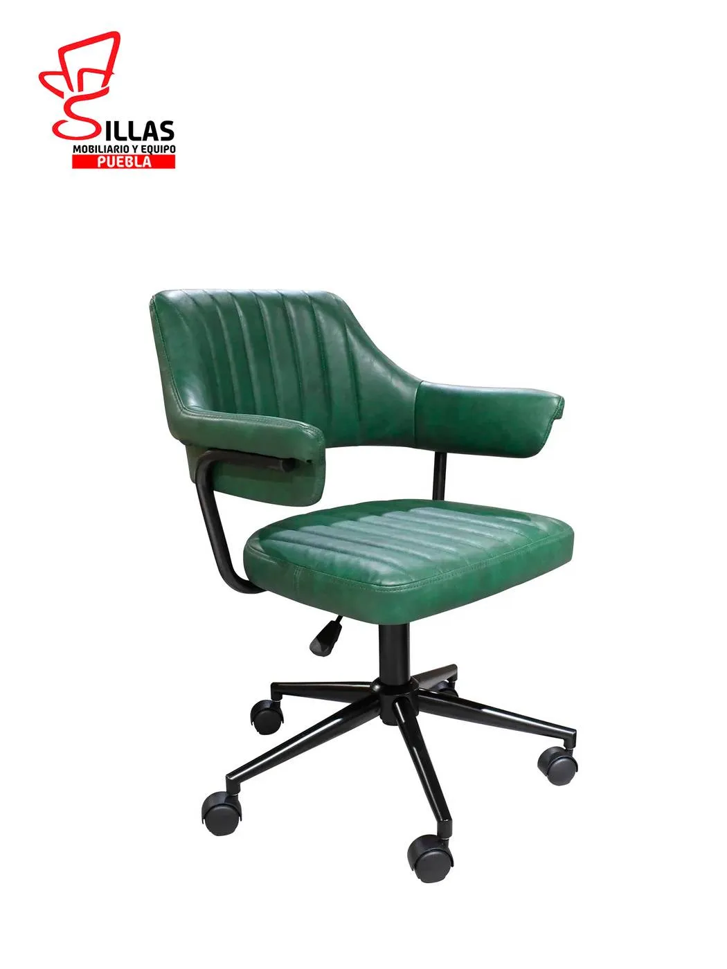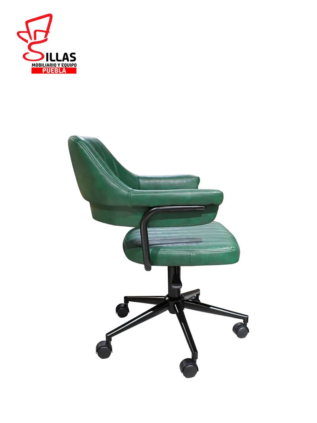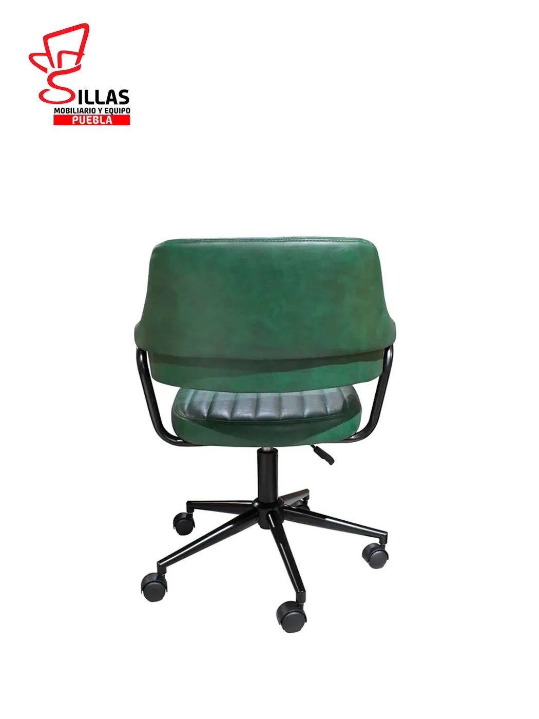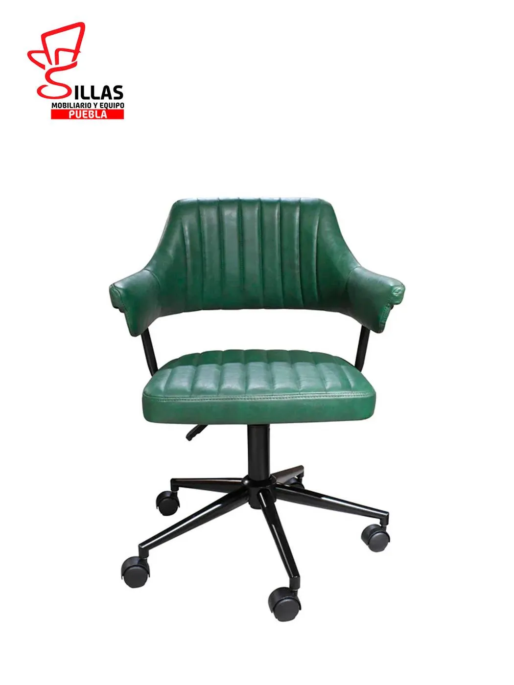 Silla Secretarial Indivar * Fabricada con internos de madera termoformada de pino , asiento y respaldo tapizado en Tactopiel color verde , dotada de estrella y ruedas de poluretano * Ancho: 57.5 Profundidad: 56 Altura: 86 cms