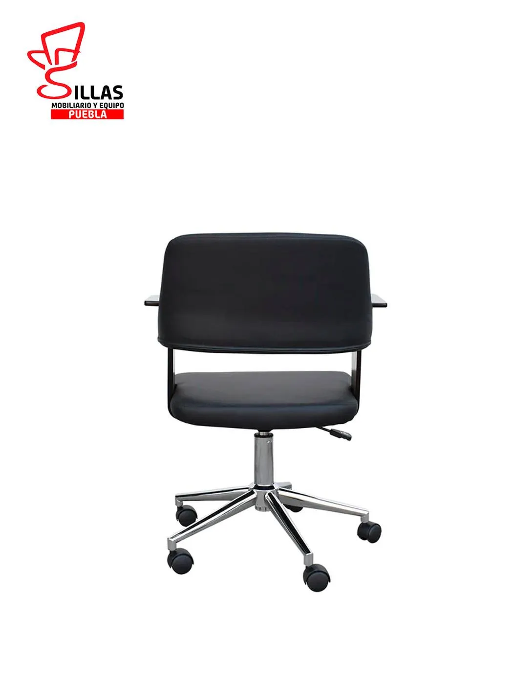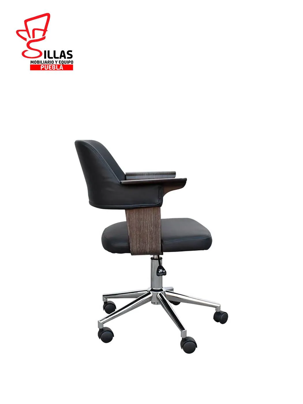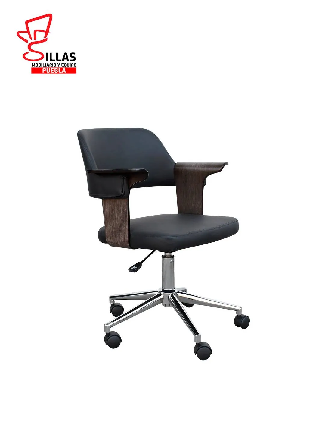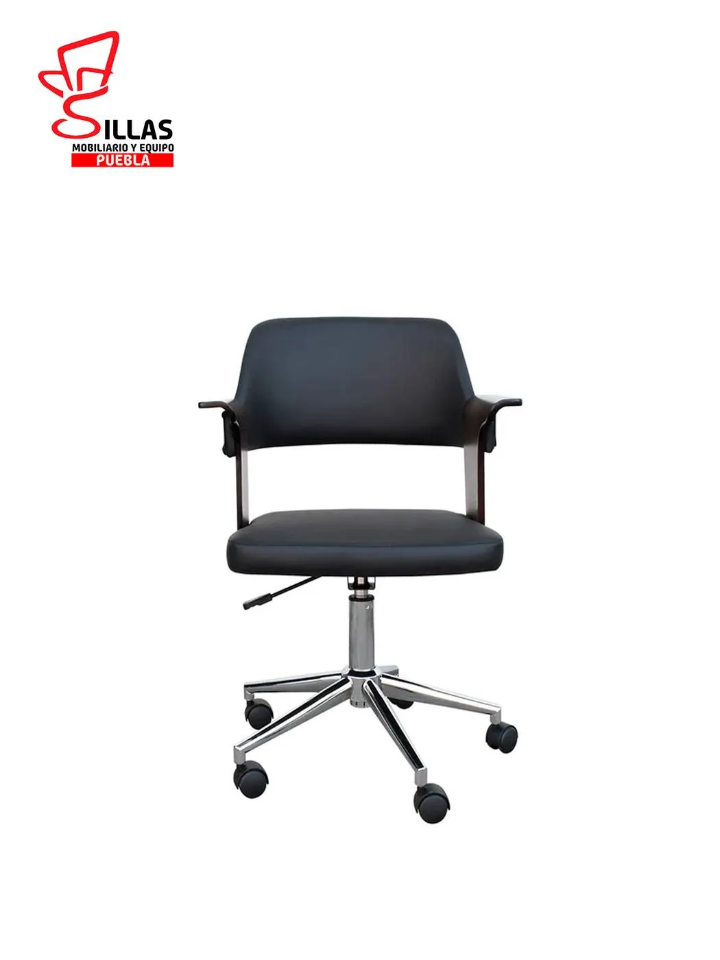 Silla Secretarial Indivar Wood * Fabricada con internos de madera termoformada , asiento y respaldo tapizado en Tactopiel color negro , dotada de estrella cromada y ruedas de poluretano * Ancho: 55 Profundidad: 59.5 Altura: 88 cms