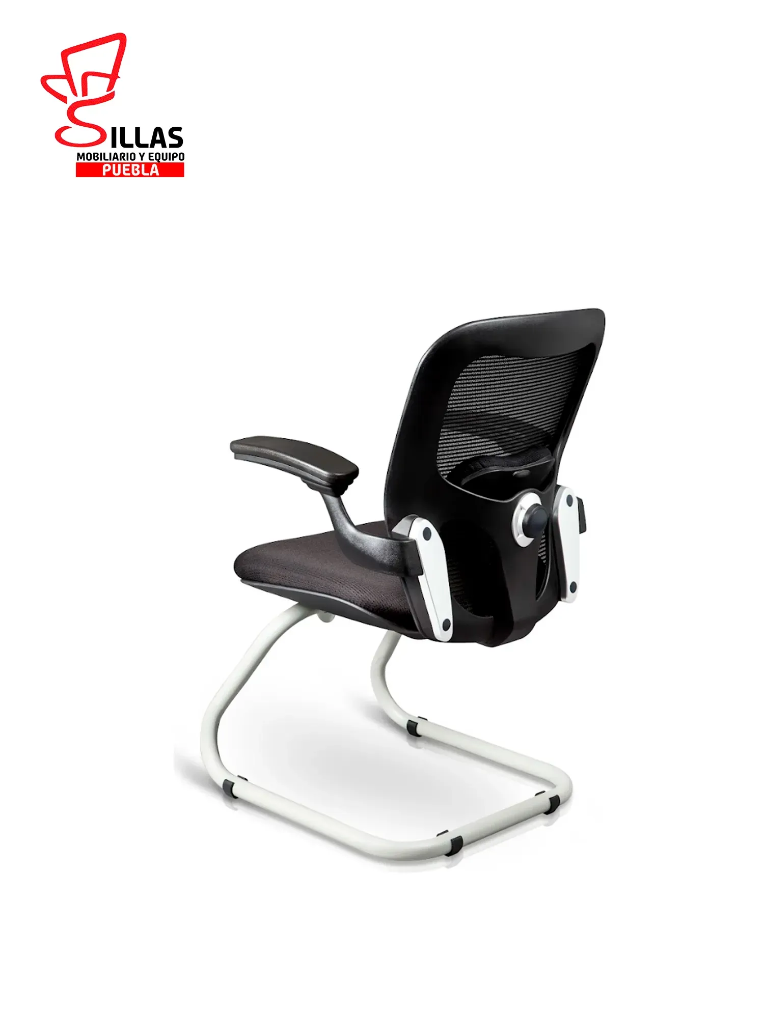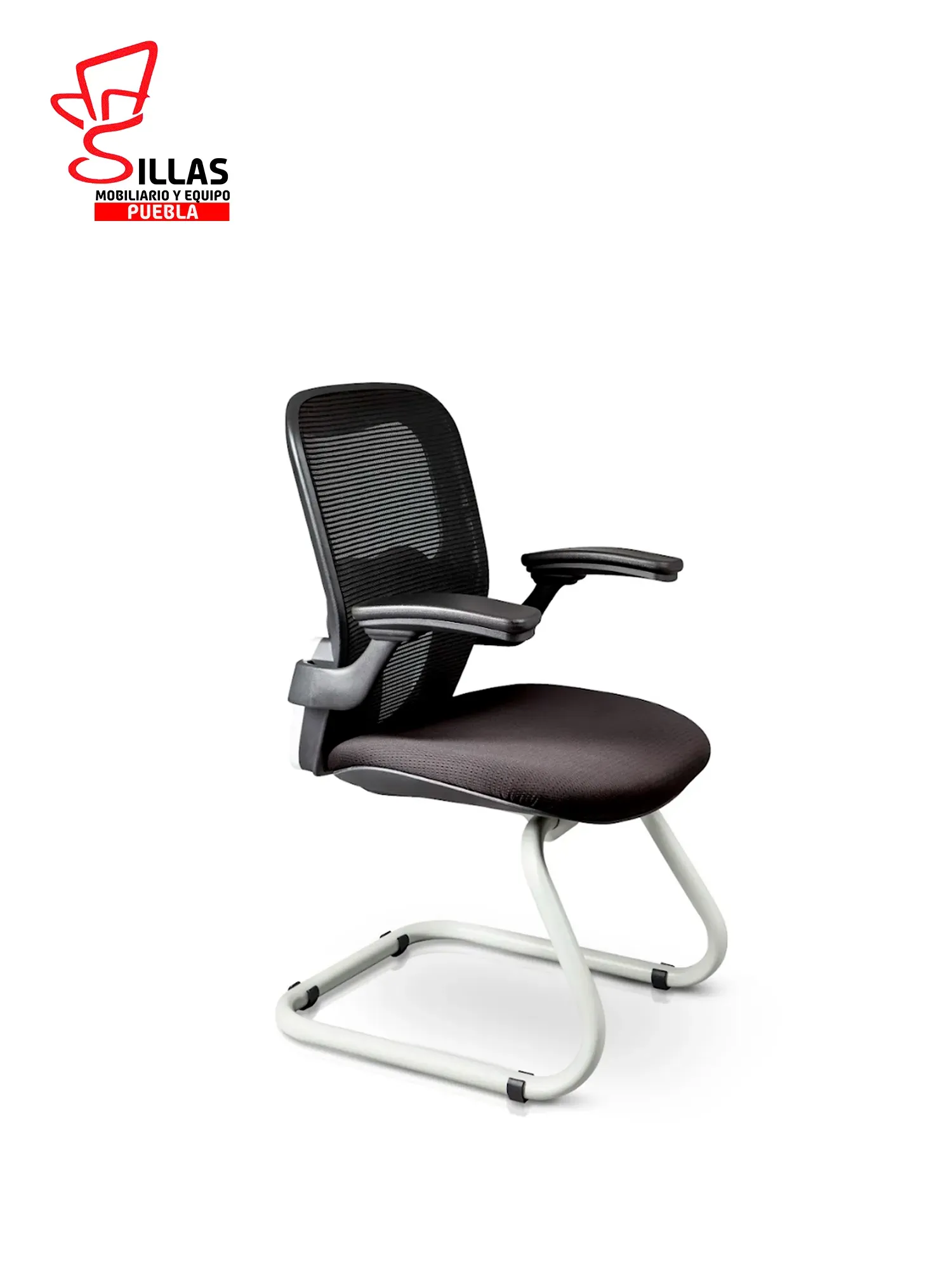 Silla fabricada en trineo de acero tubular calibre 14" color gris / Asiento tapizado en tela y respaldo en mesh / Ajuste de tensión lumbar mediante perilla / Resbalones de poliuretano color negro