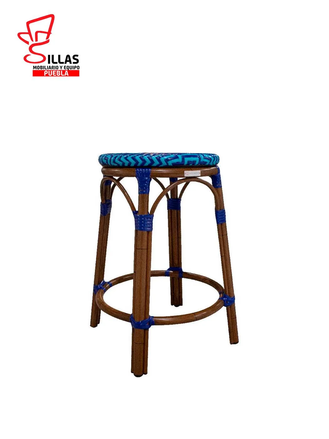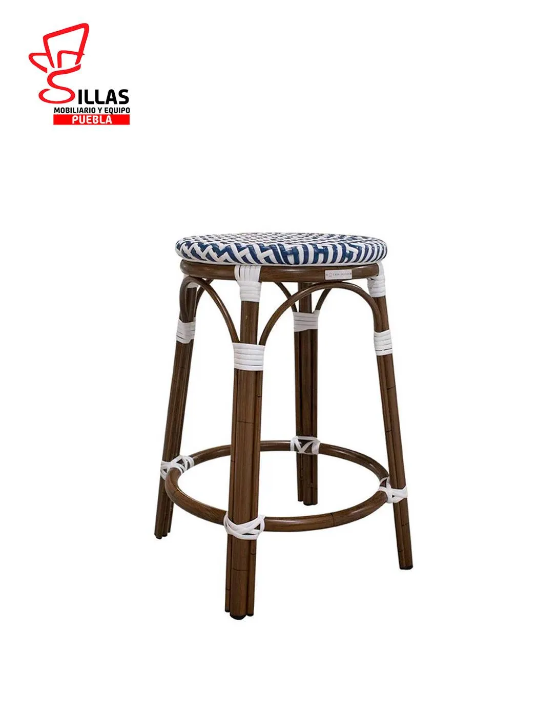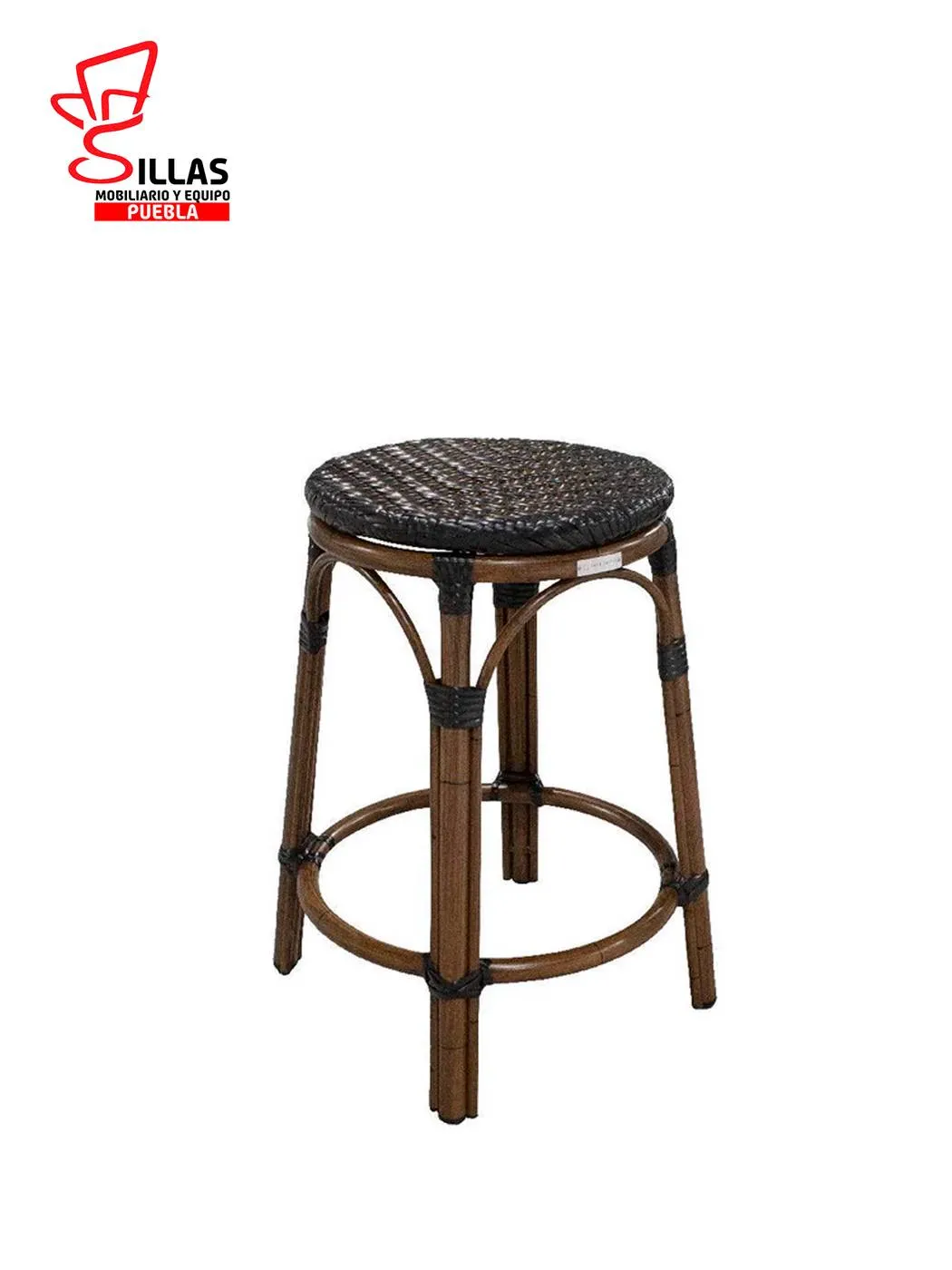 Banco Bajo Louis * Fabricado en estructura de tubo redondo de aluminio con imitación madera de bambú , recubierto en rattan sintetico de colores , ideal para barra o bar * Ancho: 37 Profundidad: 37 Altura: 62 cms