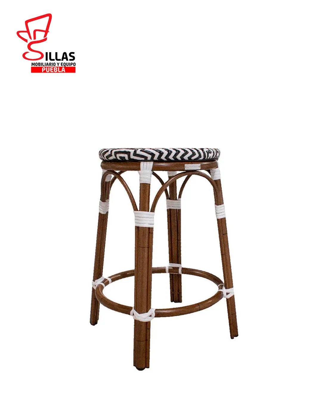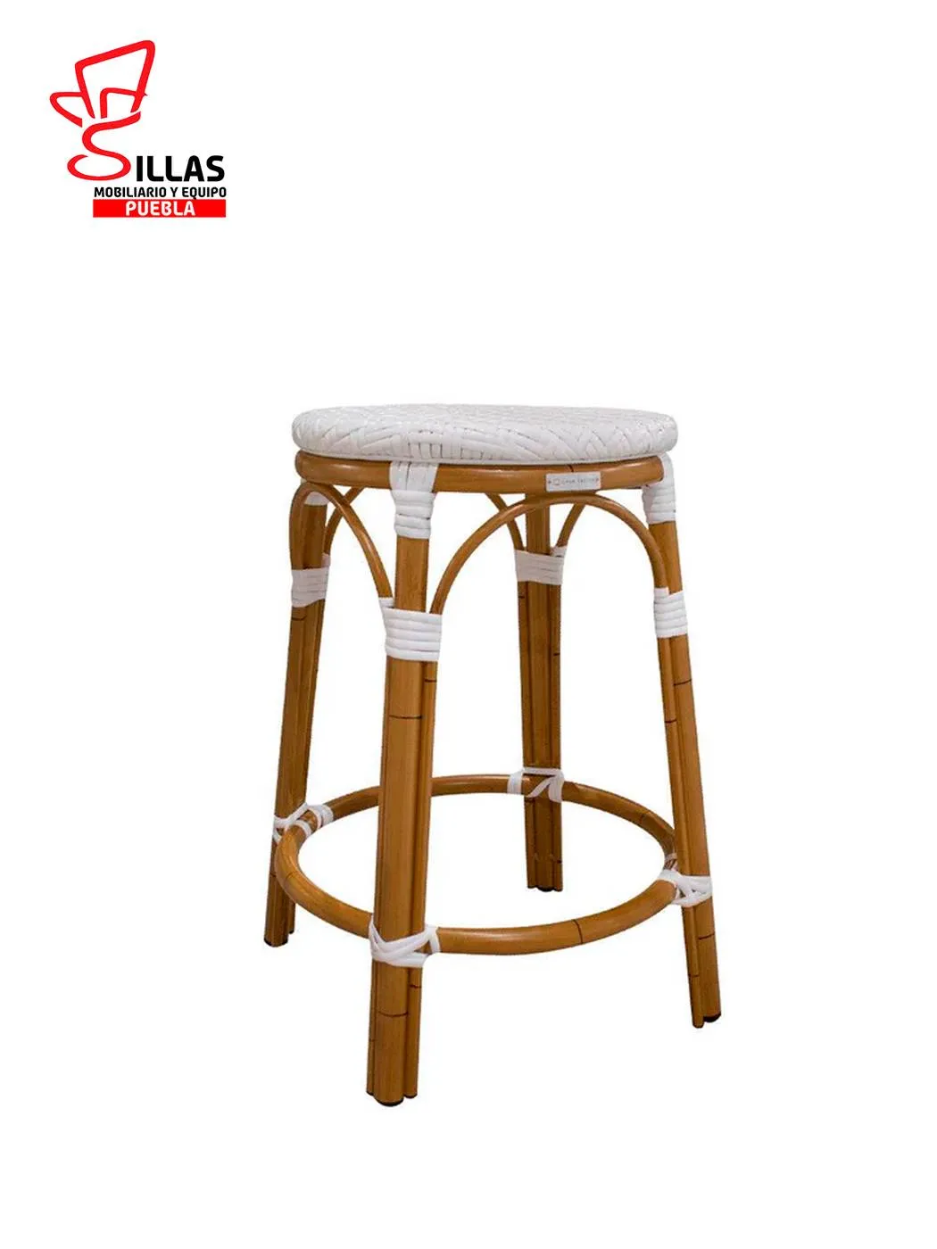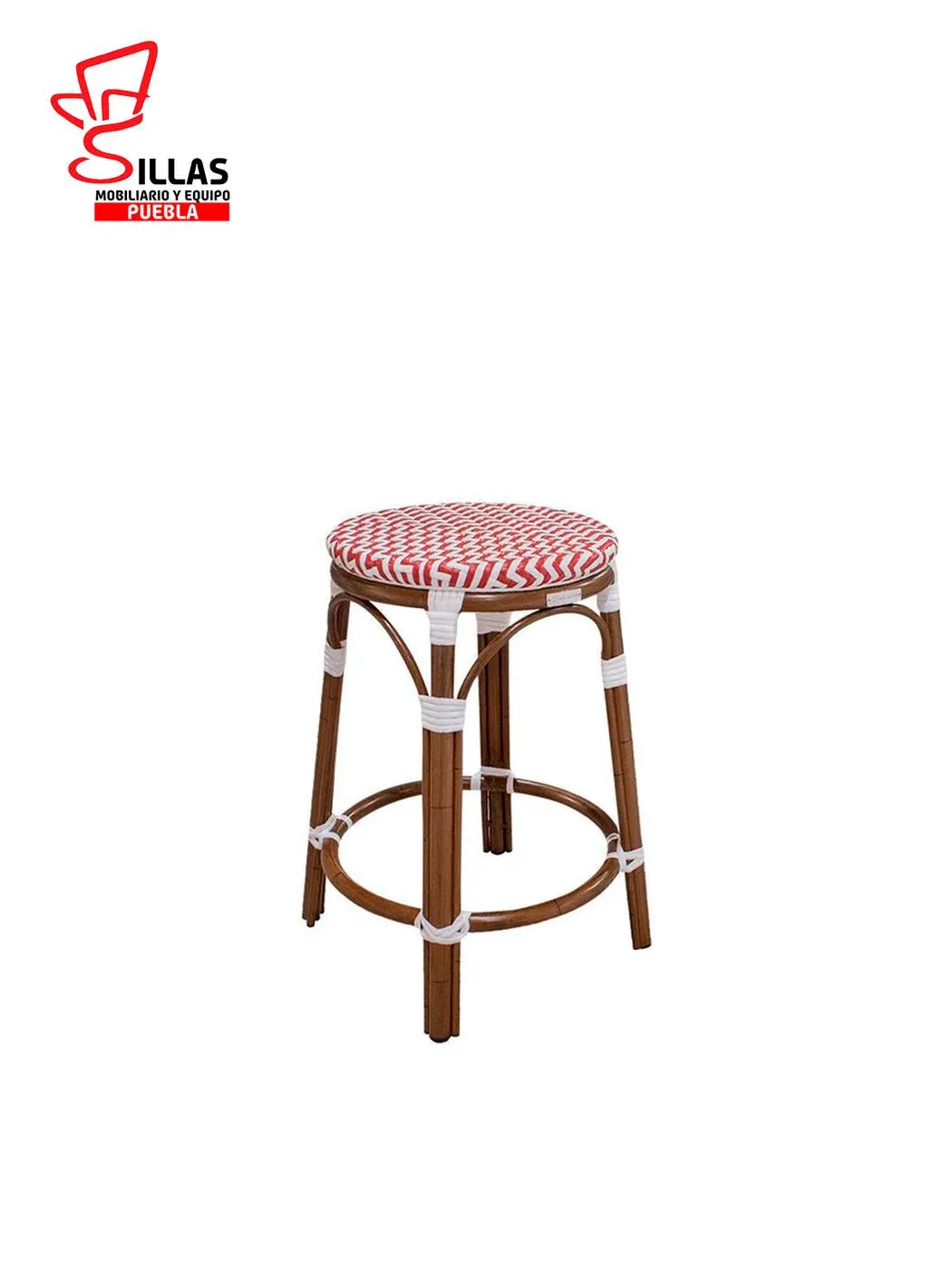 Banco Bajo Louis * Fabricado en estructura de tubo redondo de aluminio con imitación madera de bambú , recubierto en rattan sintetico de colores , ideal para barra o bar * Ancho: 37 Profundidad: 37 Altura: 62 cms