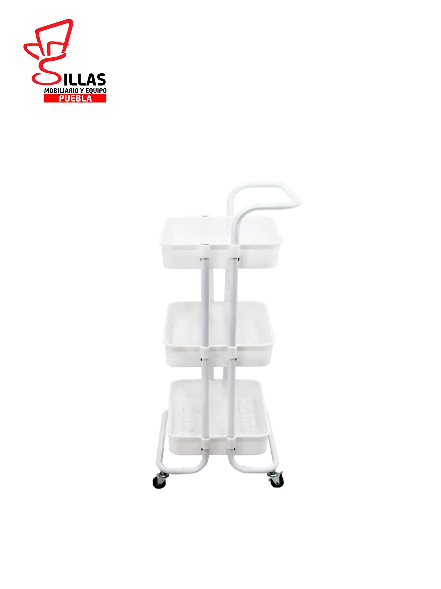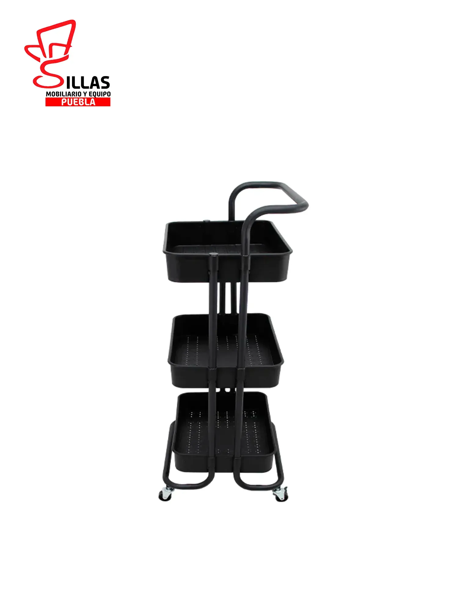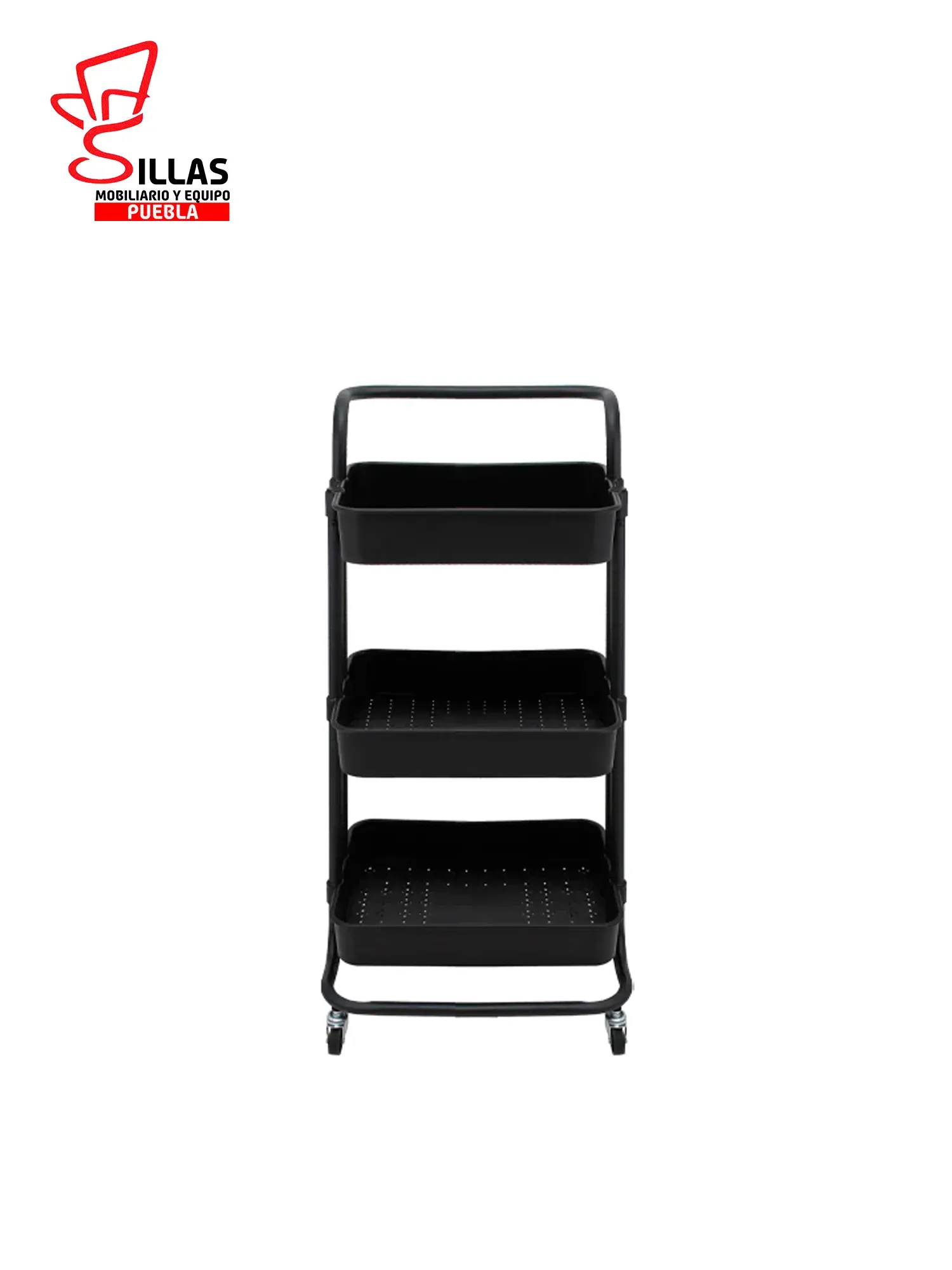 Carrito Organizador Trendy * Fabricado en estructura de tubo redondo metalica , dotada de 3 entrepaños de plástico multiperforado y ruedas de poliuretano inyectado para una movilidad práctica . Medidas Ancho: 42 Profundidad: 33 Altura: 87 cms