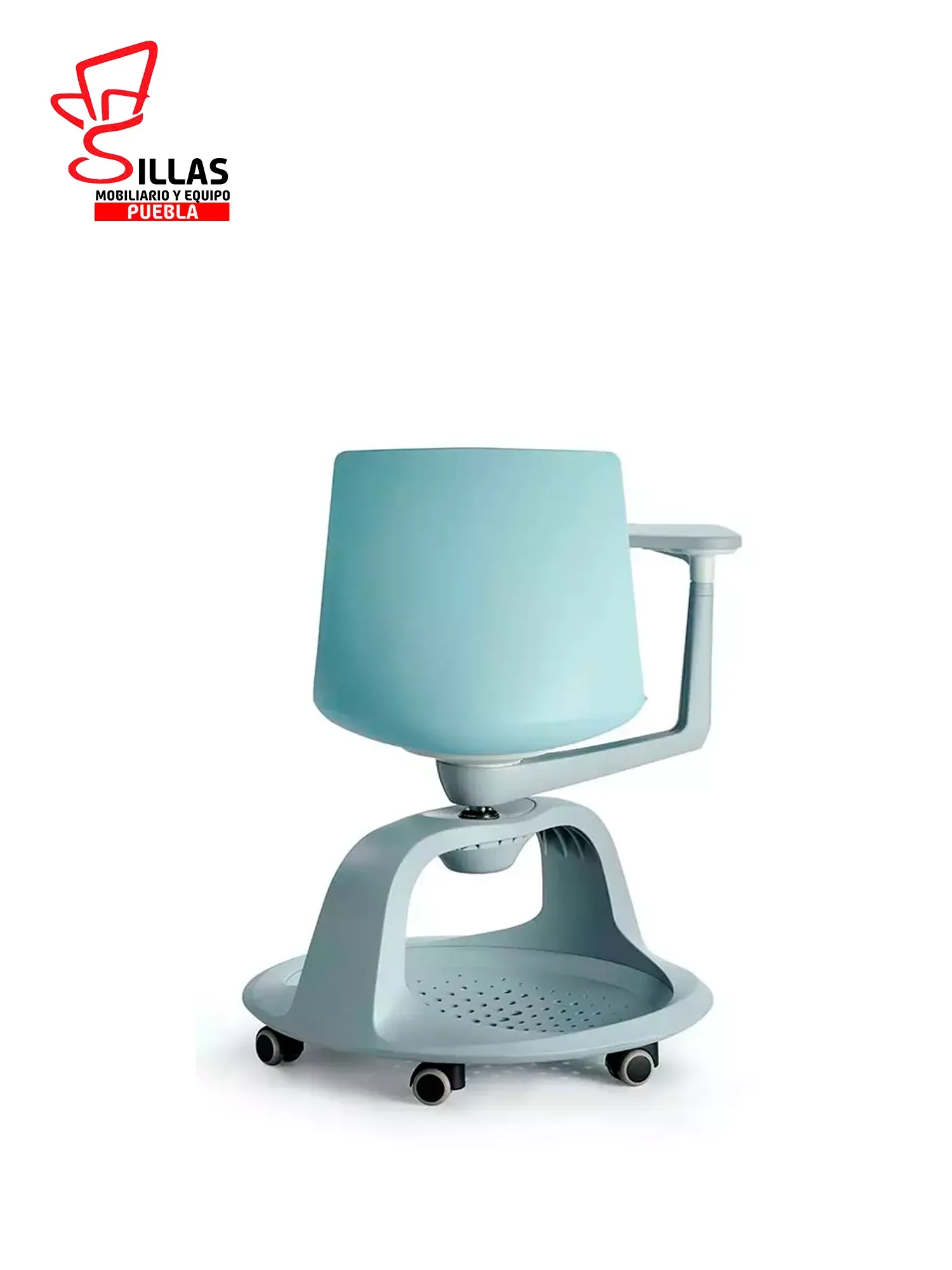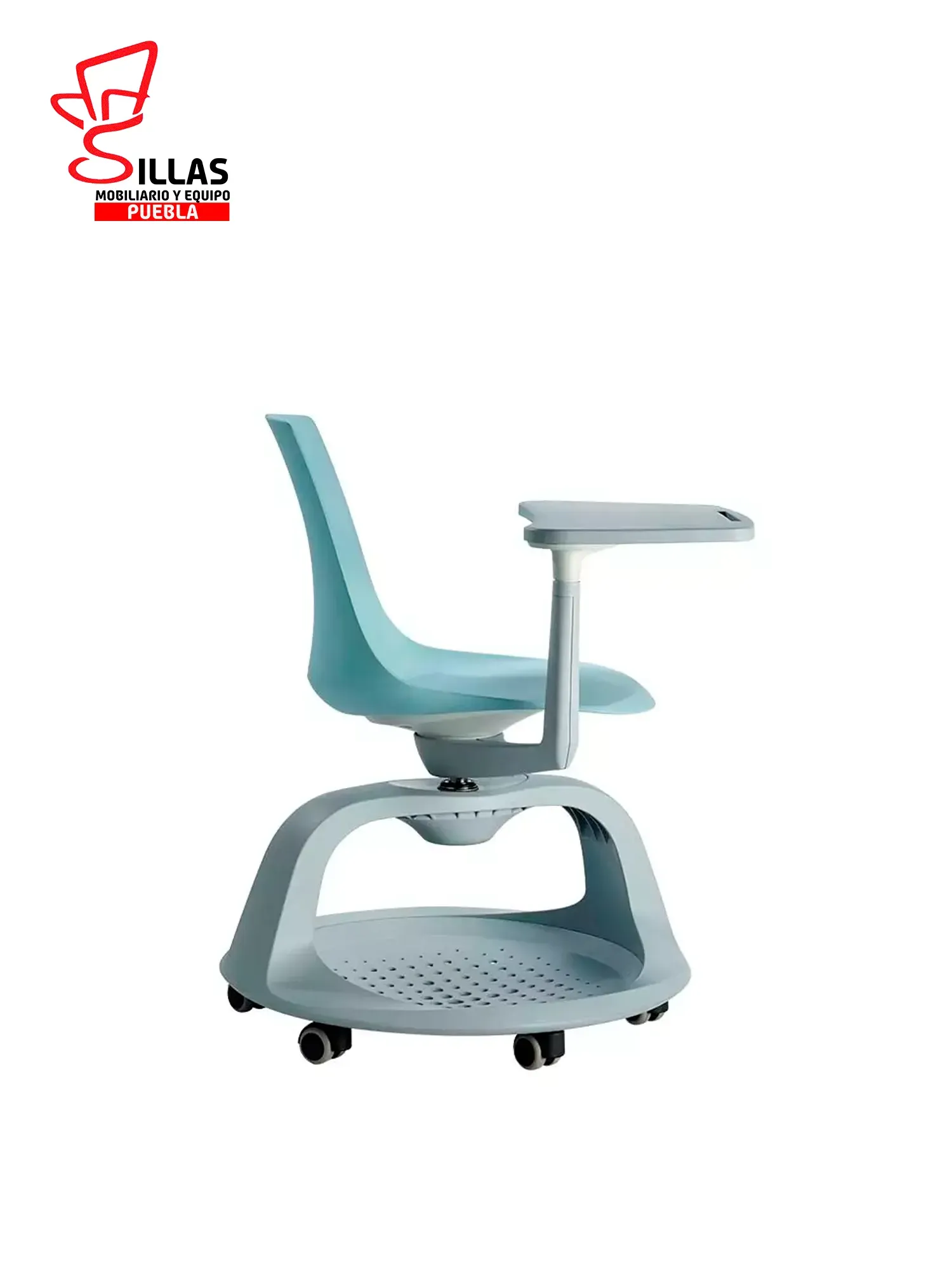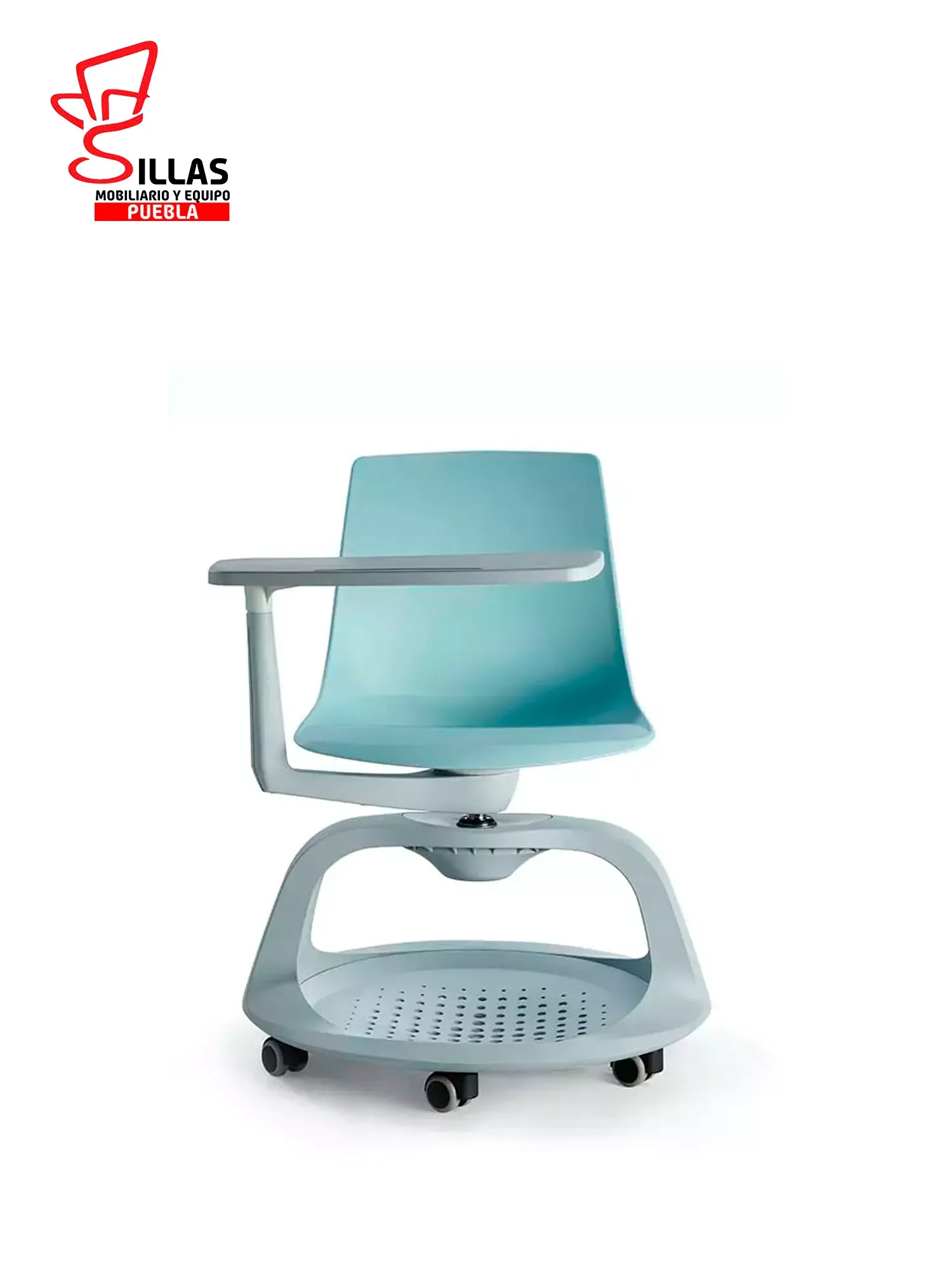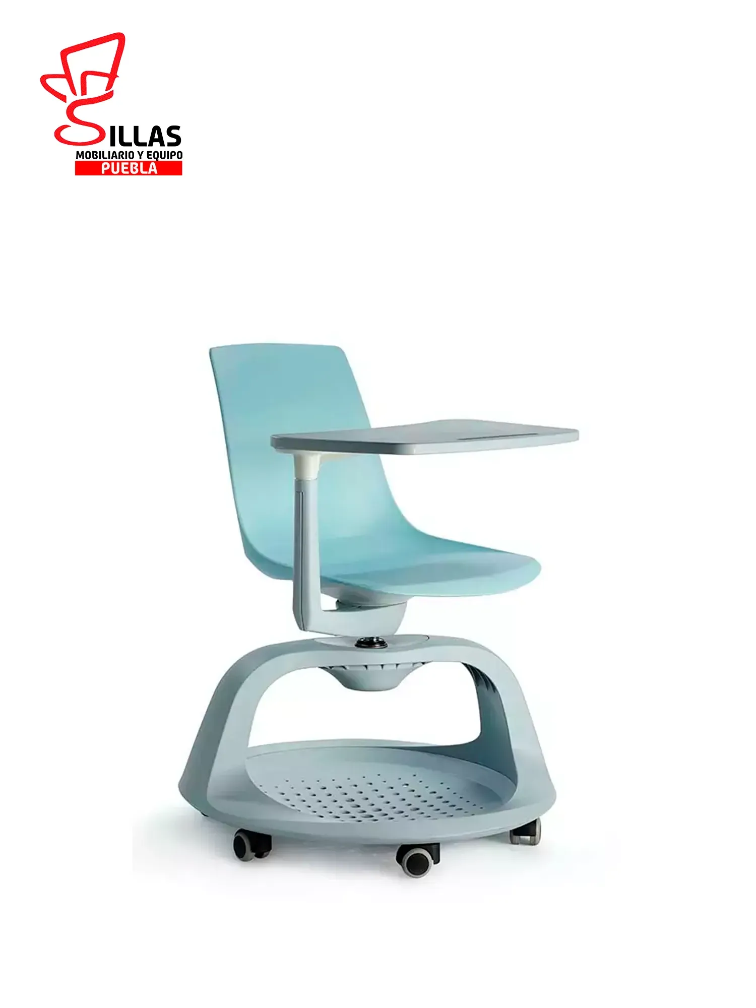 Pupitre giratorio, asiento y respaldo en una sola pieza de polipro-pileno y fibra de vidrio con diseño ergonómico, tableta de escritura giratoria 180° con ranura porta Ipad, base circular con espacio de guardado y rodamientos con cubierta de poliuretano.