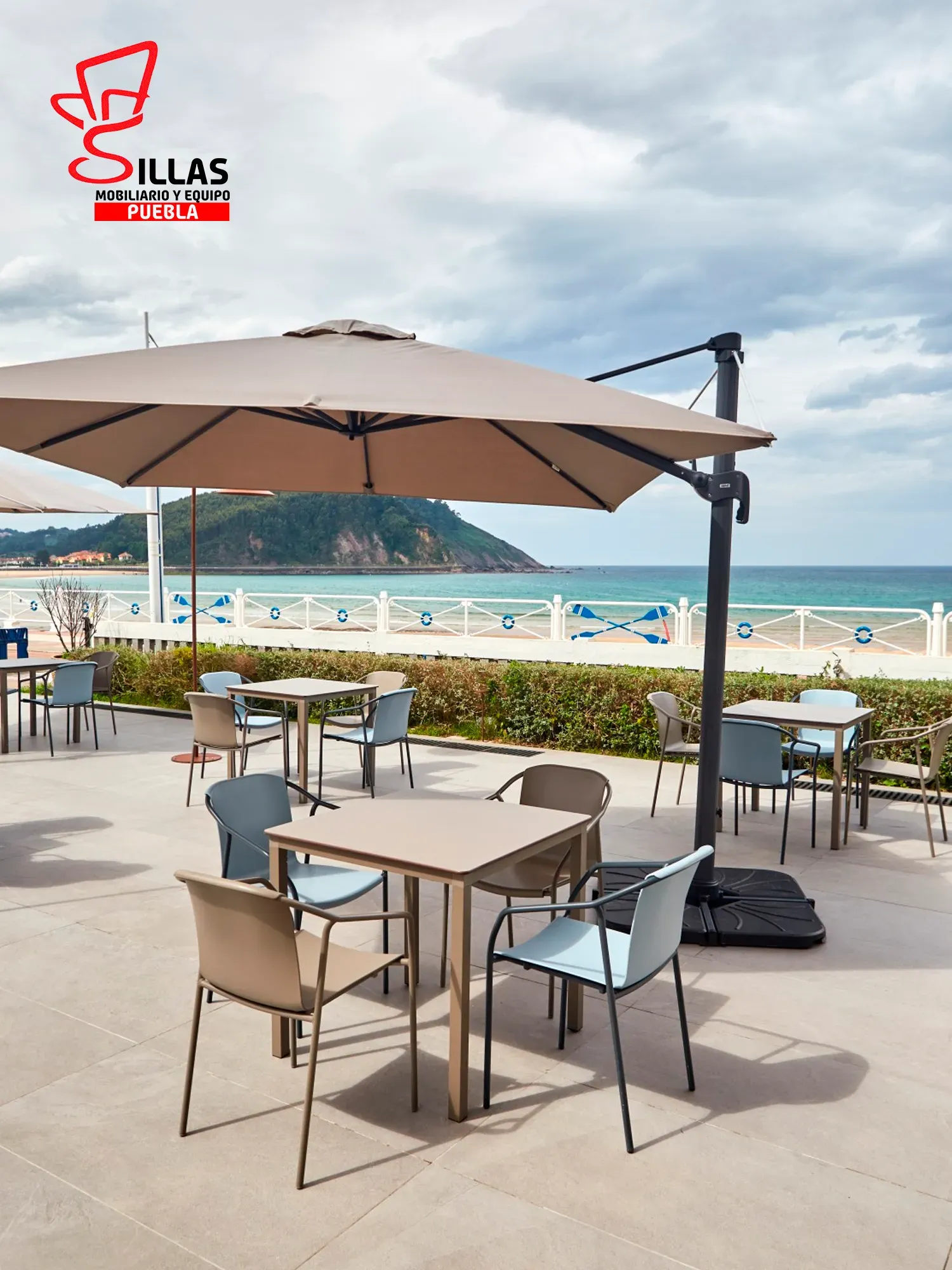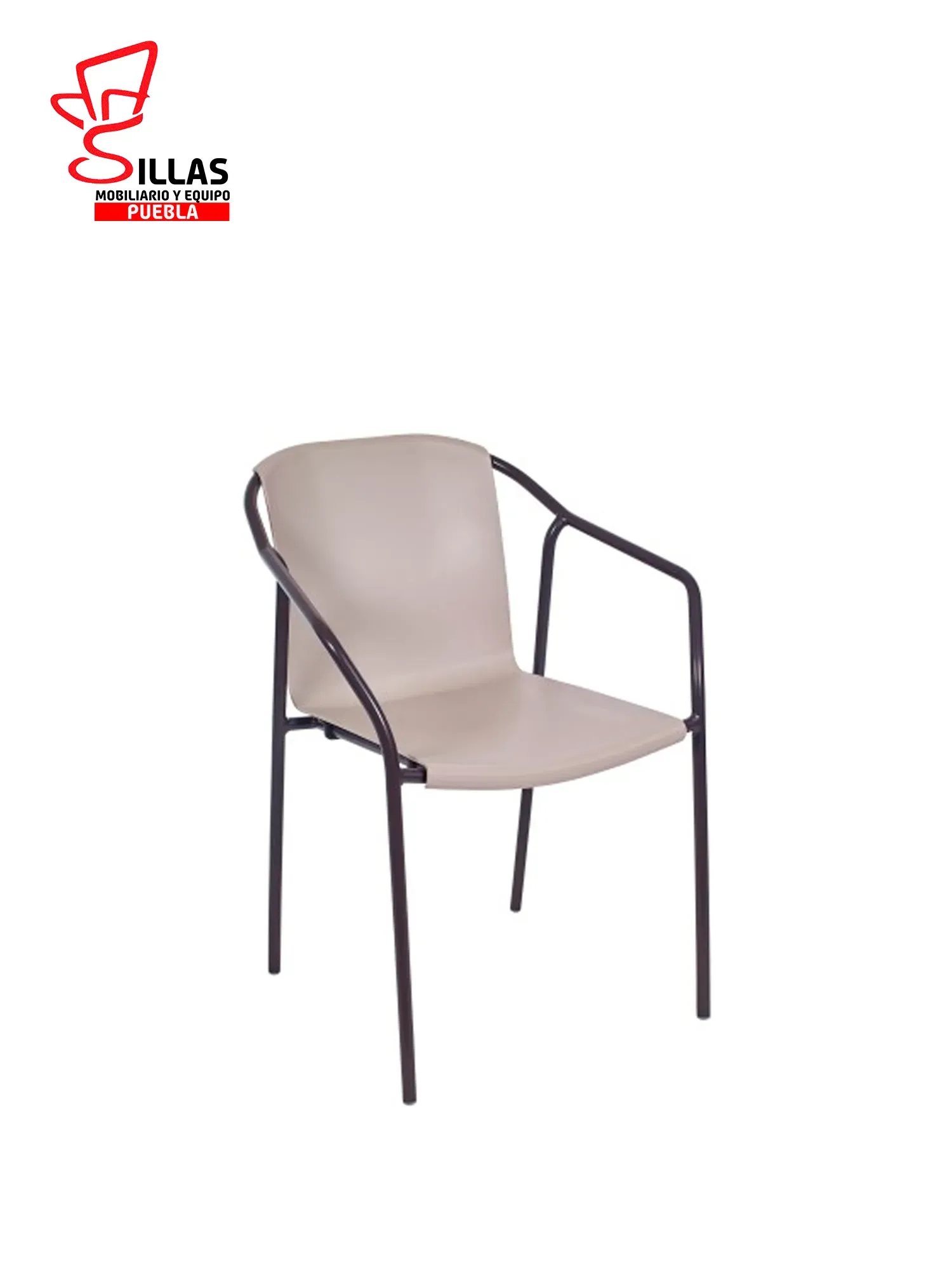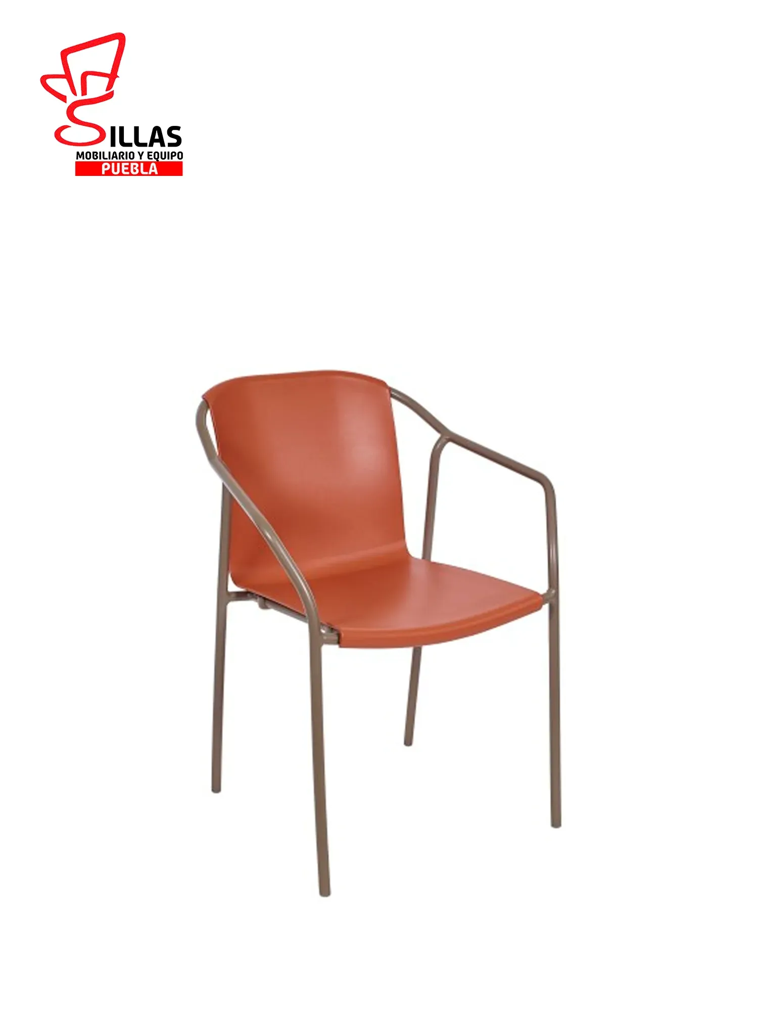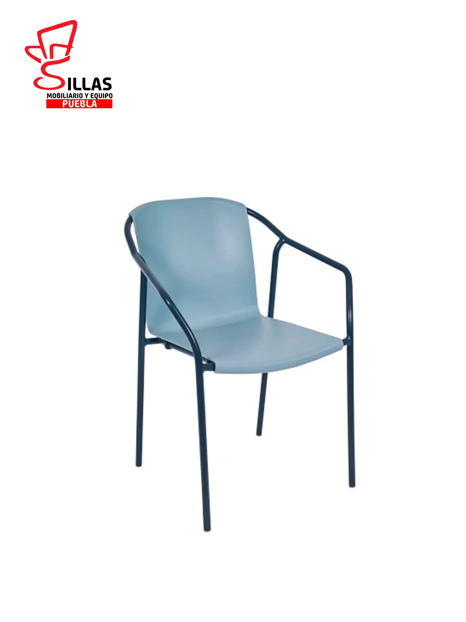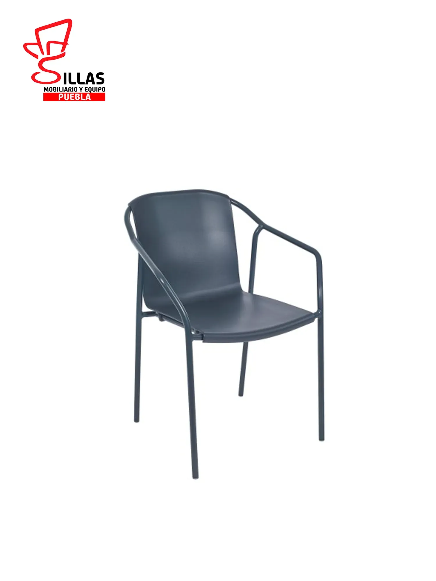 Silla con brazos apilable para uso exterior e interior. Estructura de aluminio lacado. Asiento de polipropileno. Tacos antideslizantes. 100% reciclable. Anti UV. Muy fácil de lavar y desinfectar. Producto de uso público y doméstico.