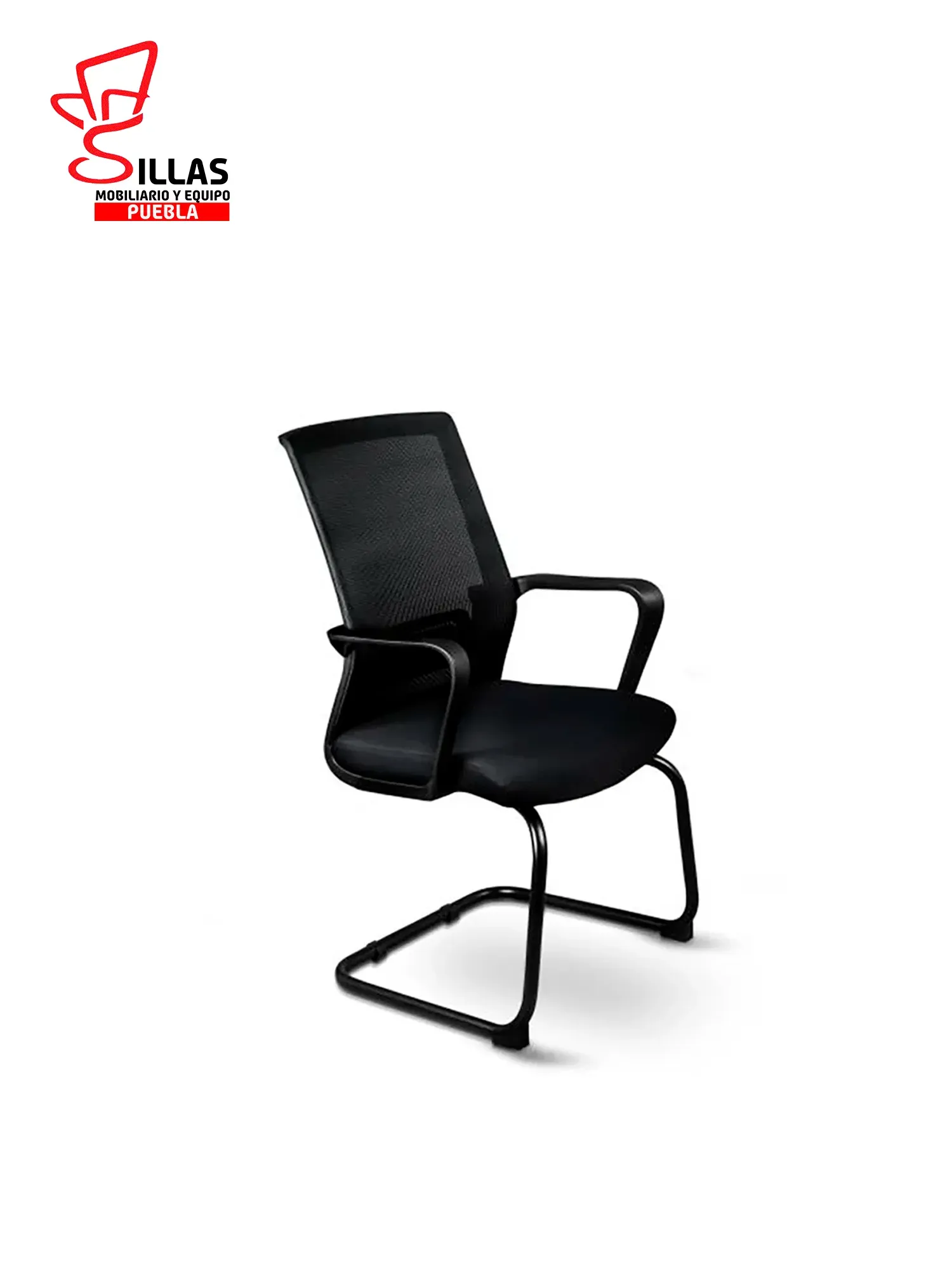 Respaldo tapizado con malla / Respaldo lumbar de polipropileno ajustable en altura / Brazos fijos de polipropileno en forma T sujetos al asiento / Asiento tapizado en tela / Estructura de Trineo de acero