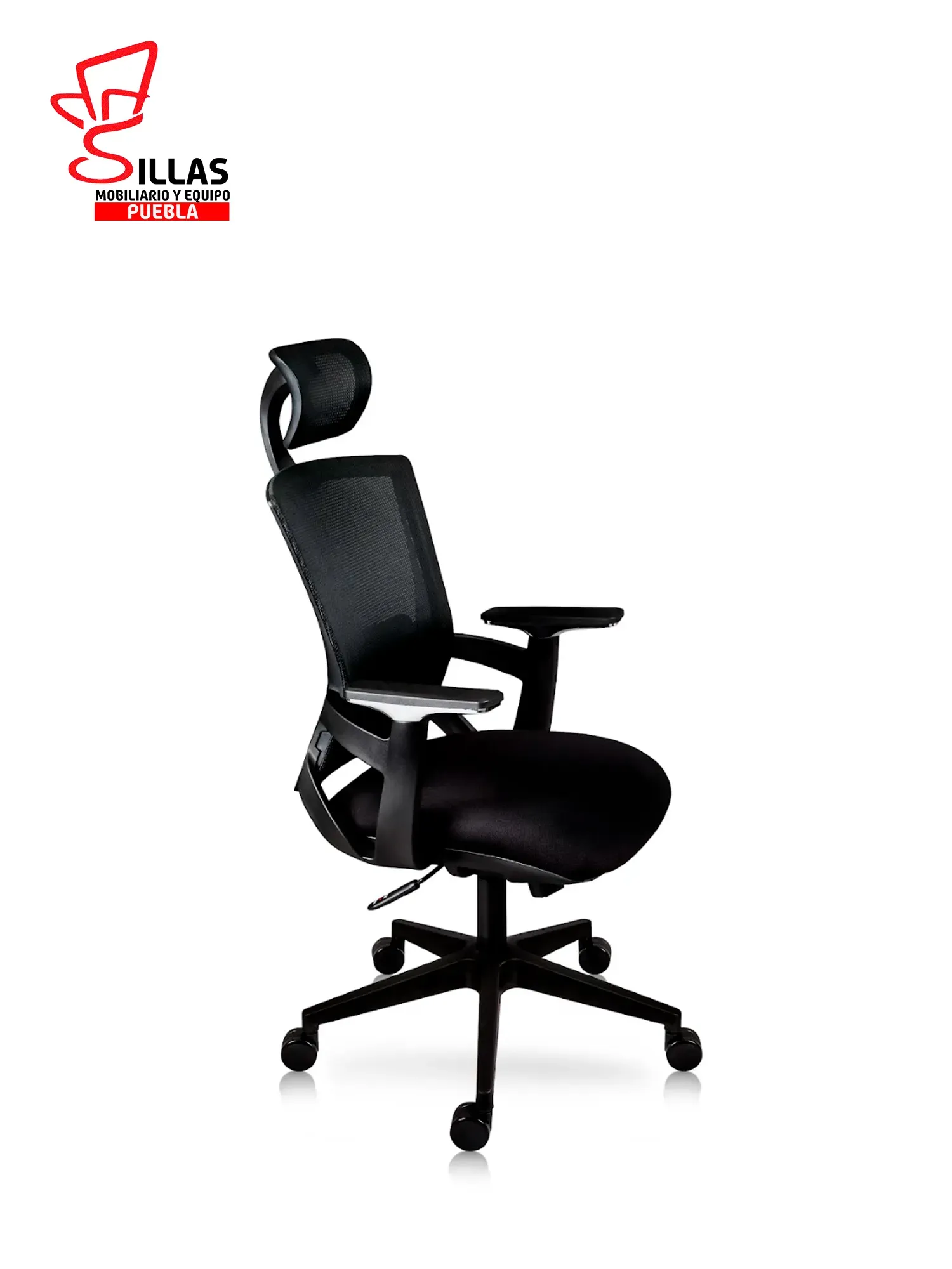 Silla Ejecutiva con cabecera / Respaldo tapizado en malla con soporte lumbar ajustable / Cabecera tapizada en malla y ajustable en altura / Asiento de espuma estándar tapizado en tela tipo mesh / Brazos de polipropileno con acabados cromados / Mecanismo con palanca para...