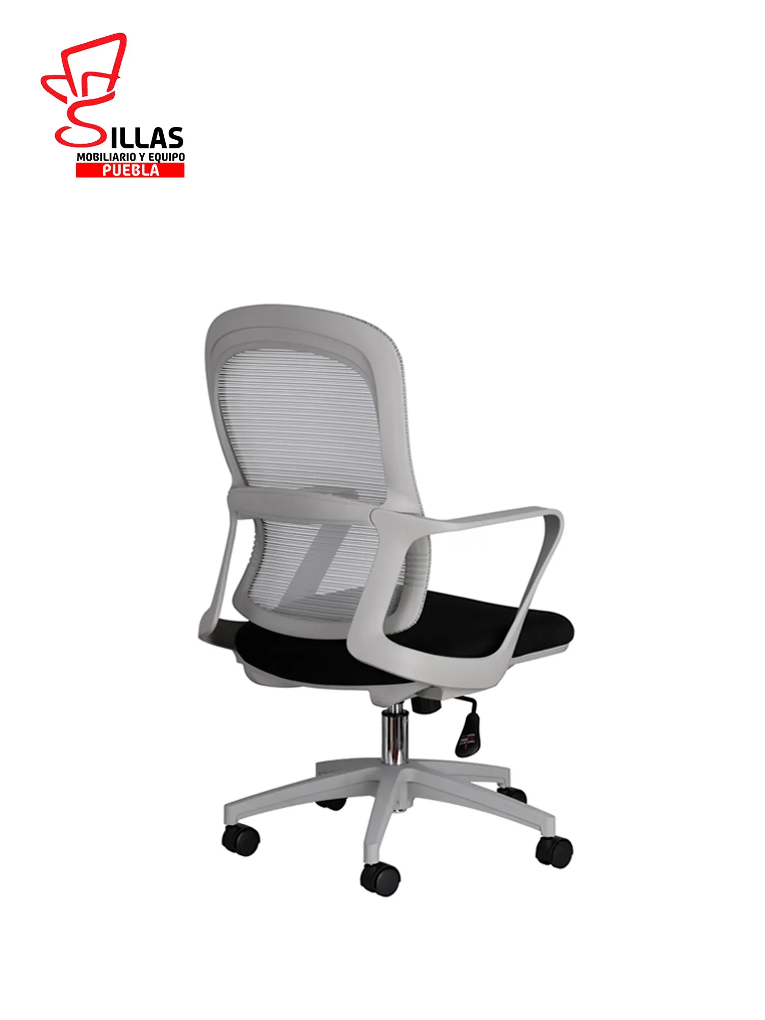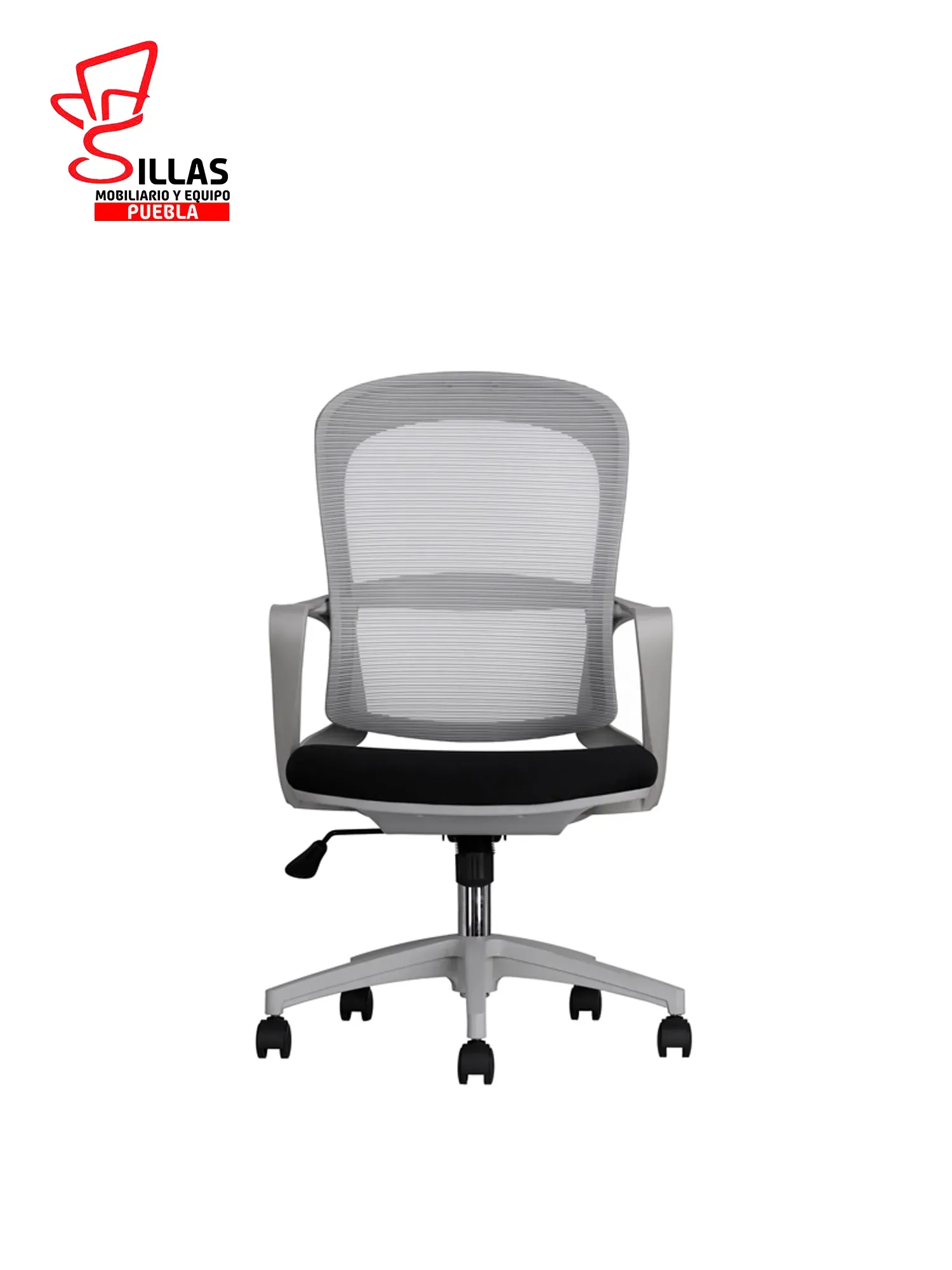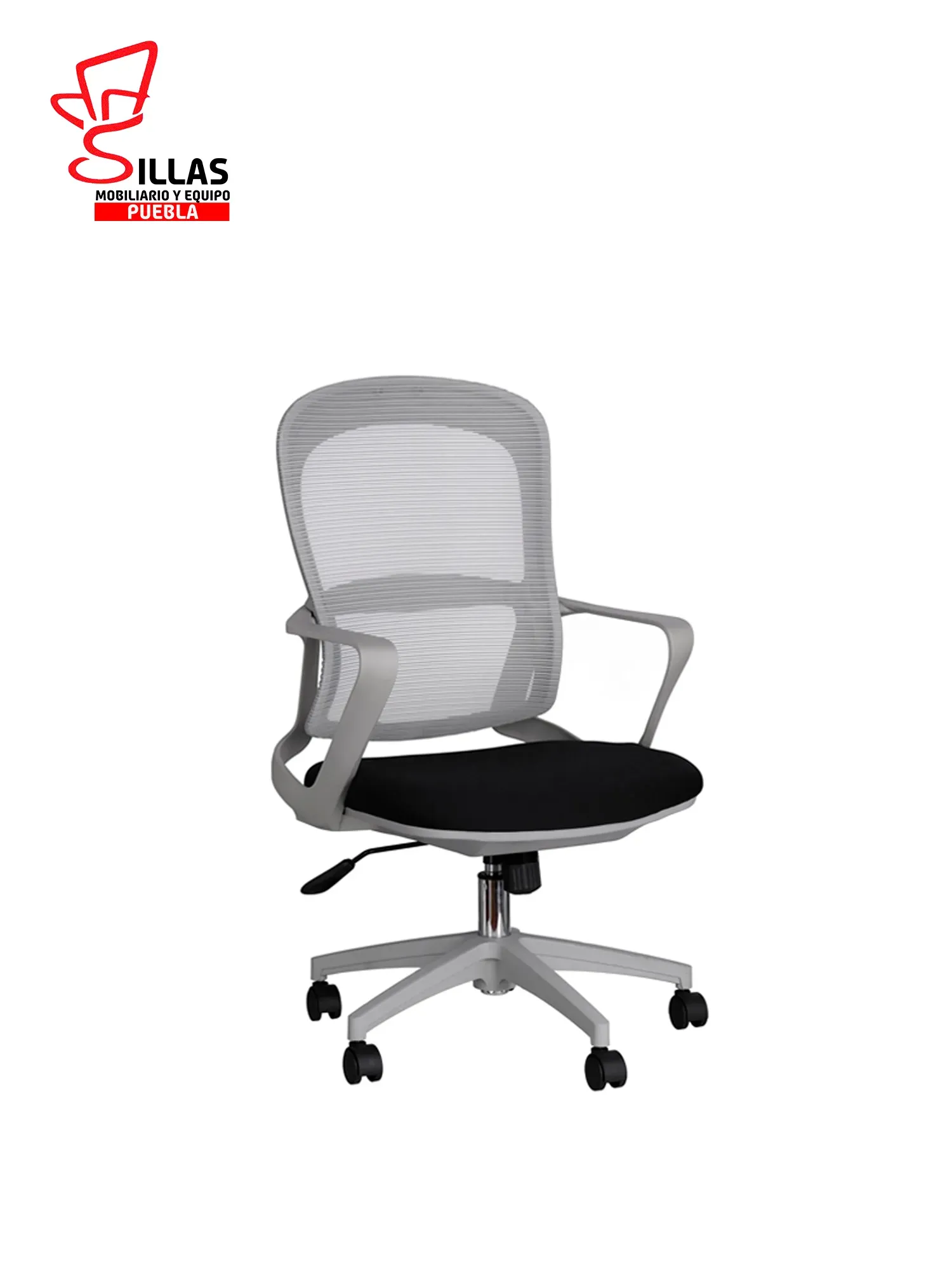 Respaldo con malla tensada / Asiento tapizado en tela color negro / Brazos fijos a tono de estructura / Mecanismo reclinable con bloqueo de posiciòn / Pistòn ajustable en altura en cromo / Base de estrella con ruedas de 50 MM inyectadas en poliuretano